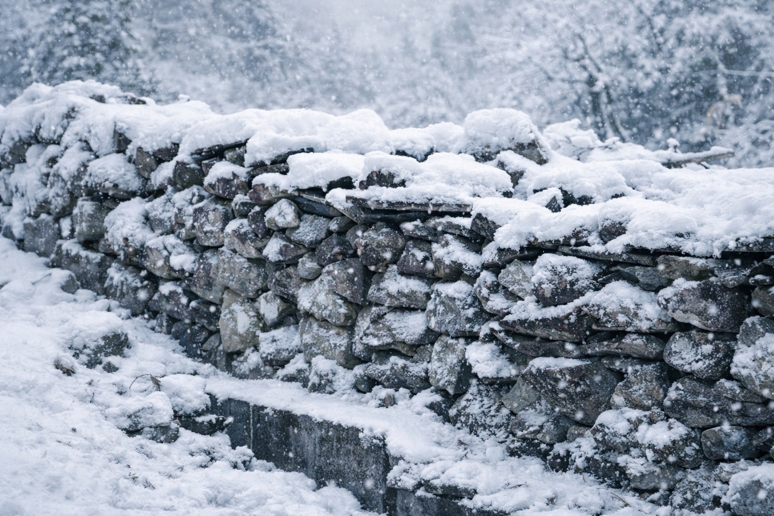 山の斜面に沿って築かれた石積みの段々畑は、雪解けの水をやさしく受け止め、